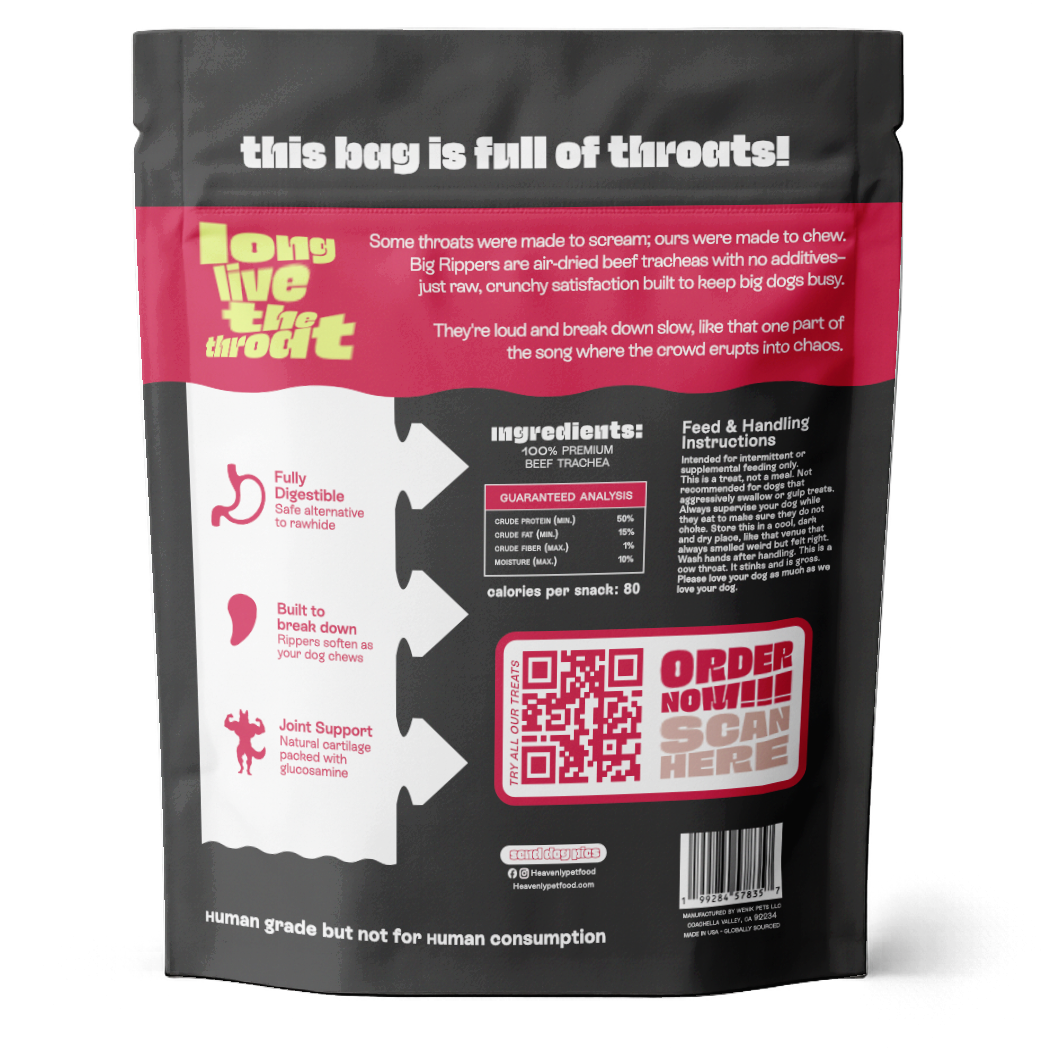 LOUD and Built to Break Down; SLOW. Big Rippers are 6" air-dried beef tracheas with the crunch and chew your big dog lives for. These naturally nutrient-packed treats support joint health, clean teeth, and satisfy the primal urge to absolutely destroy something. They're the breakdown in the middle of the set—the moment the floor opens up and everything goes wild.