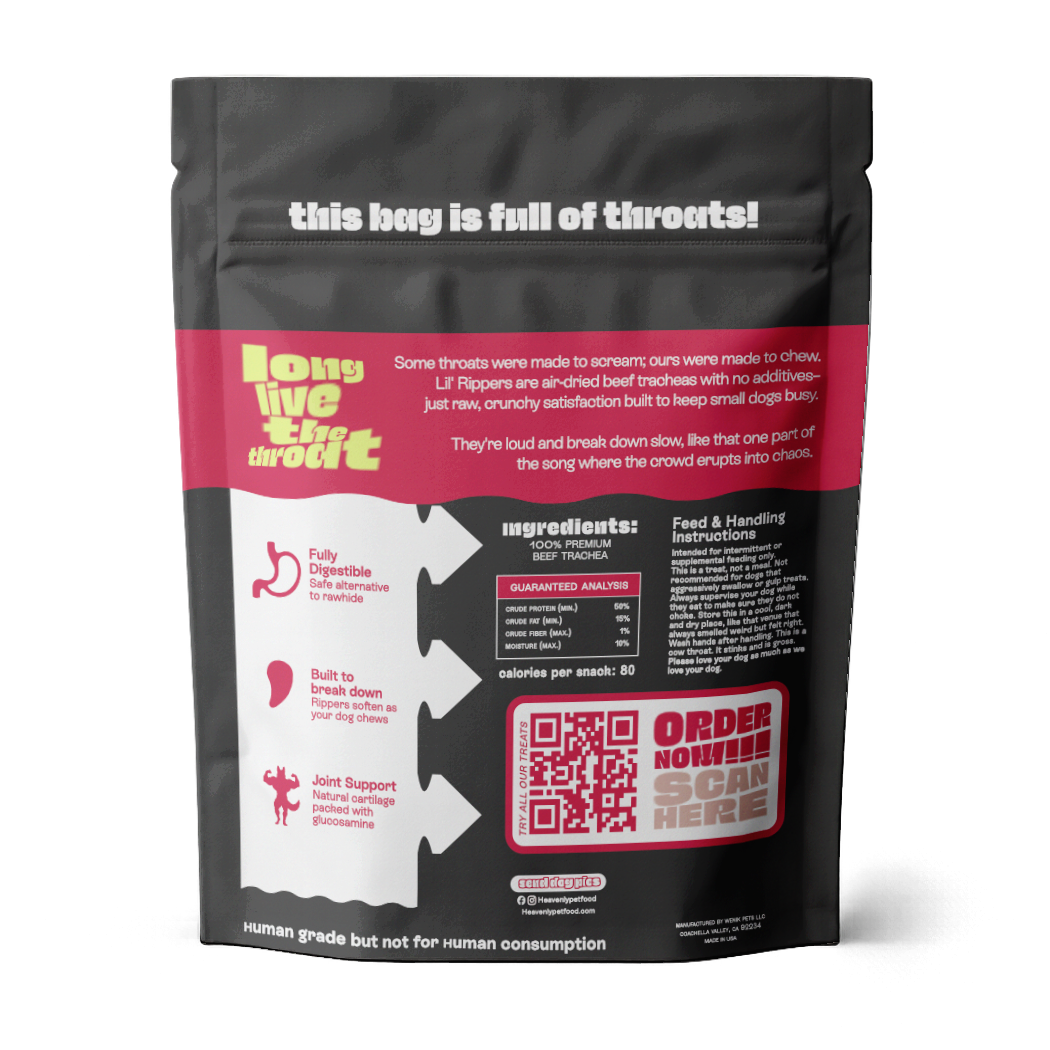 LOUD and Built to Break Down; SLOW. Lil' Rippers are 2-3" air-dried beef tracheas with the crunch and chew your small dog lives for. These naturally nutrient-packed treats support joint health, clean teeth, and satisfy the primal urge to absolutely destroy something. They're the breakdown in the middle of the set—the moment the floor opens up and everything goes wild.
