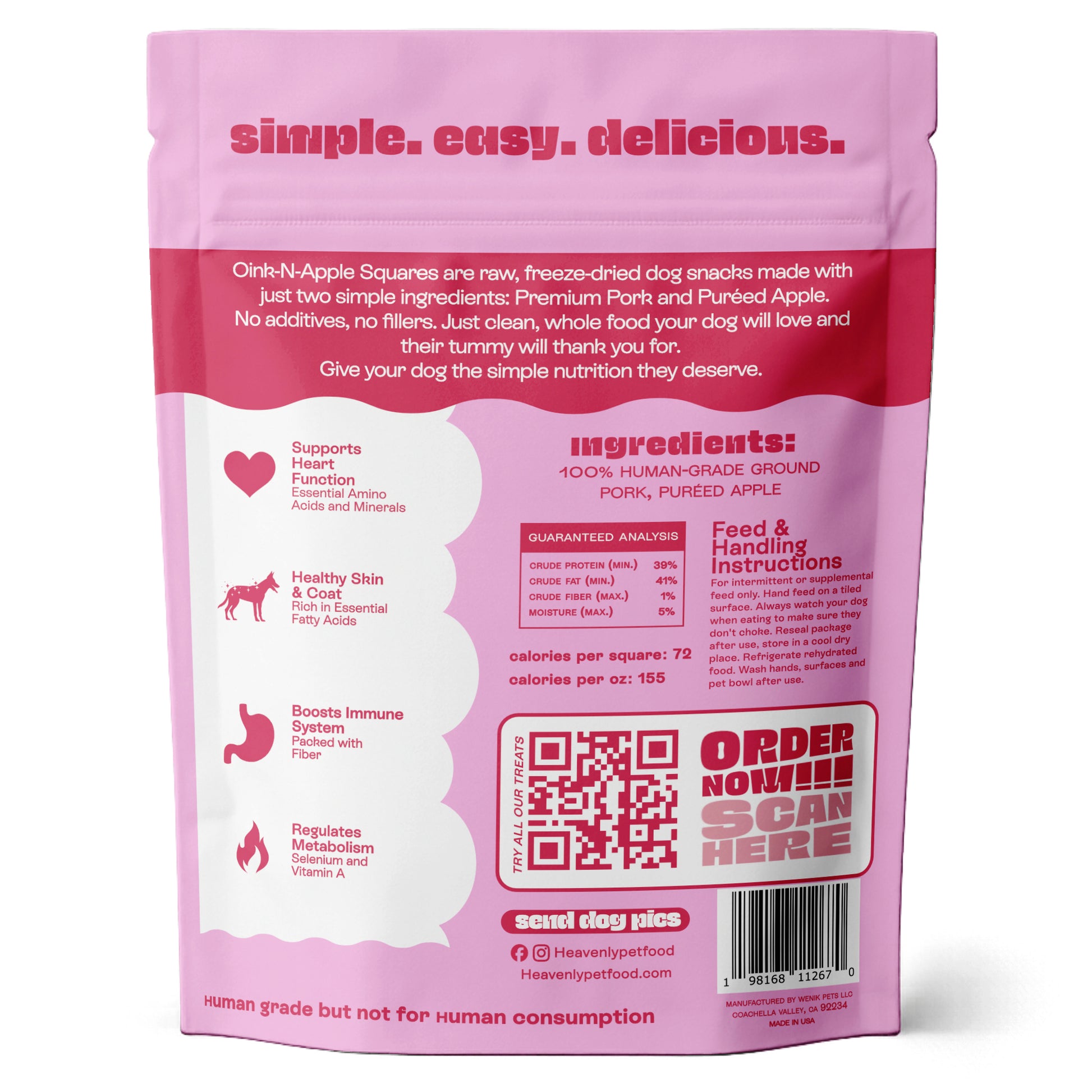 Savory, slightly sweet, and downright irresistible! Oink-N-Apple Squares combines rich, protein-packed pork with crisp, tangy apples for a snack that’s as simple as it is satisfying. Freeze-dried to lock in nutrients and flavor, it’s a clean, no-filler reward that fits into any routine—whether you’re training, bonding, or just giving your dog something worth crunching on.